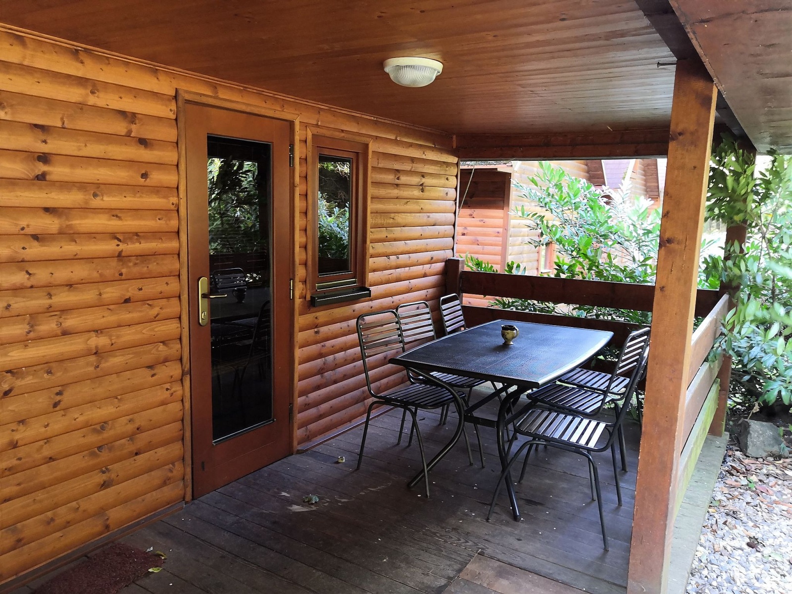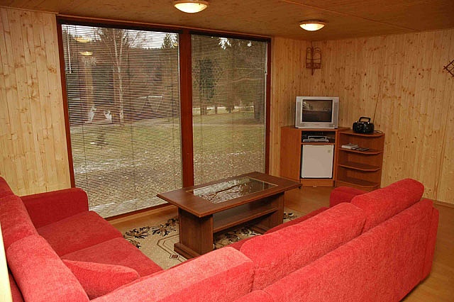 Skládá se ze dvou ložnic (2+4 lůžka), obývacího pokoje s jídelnou a kuchyňským koutem, koupelny se sprchou a WC a velkou zastřešenou terasou se zahradním nábytkem. Chata je vybavena podlahovým vytápěním, TV, SAT, DVD, WiFi zdarma, fénem, žehličkou, vařičem, mikrovlnou troubou, malou lednicí (objem lednice 45 l), varnou konvicí a základním kuchyňským nádobím (mimo utěrky nádobí). V ceně pronájmu je povlečení, osušky a jedno parkovací místo pro osobní automobil.